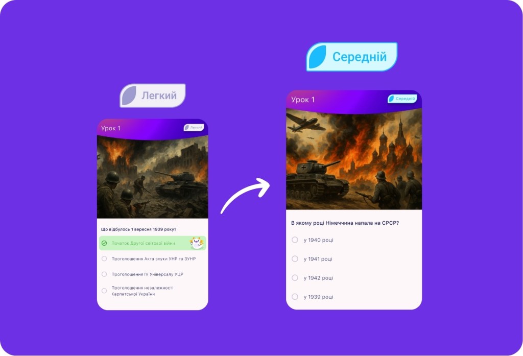 Це як бути у власному рейтингу героїв — тільки замість того, щоб бити поганців, ти долаєш історичні теми. Щоденні челенджі, короткі сесії, миттєві нагороди — все, щоб ти не просто вчився, а отримував від цього задоволення.